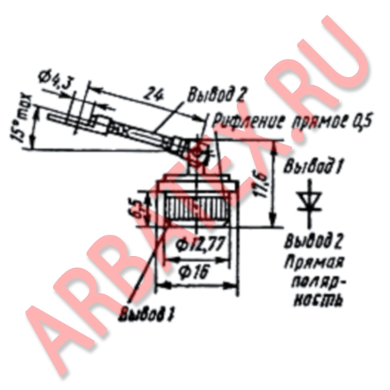У диодов прямой полярности анодом является корпус (маркируется красной риской), обратной полярности — жесткий или гибкий вывод (маркируется черной риской).